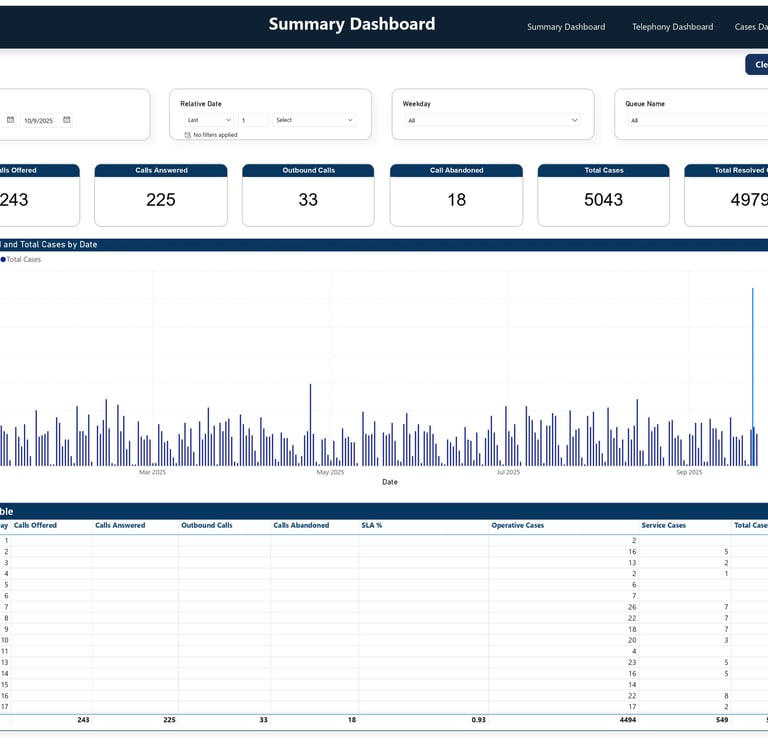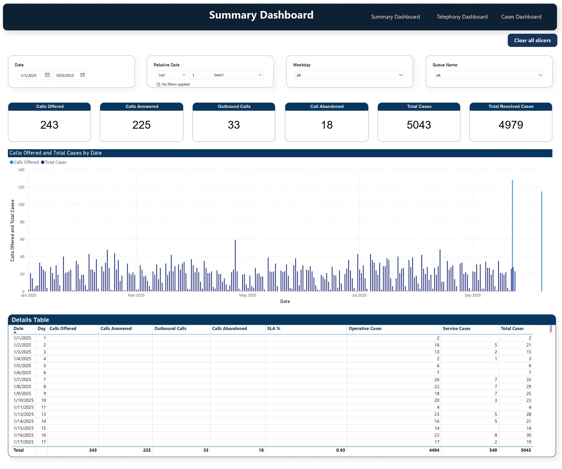 The Summary Dashboard provides a consolidated, executive-level view of overall service and call center performance. It captures key operational KPIs such as total calls offered, calls answered, abandoned calls, outbound calls, total cases, and resolved cases, enabling leadership to quickly assess service load and resolution efficiency. Time-based trend analysis highlights fluctuations in call volume and case creation over time, while detailed tables support validation at a daily granularity. This dashboard acts as the primary control panel for senior stakeholders, answering the critical question of how effectively the service operation is handling incoming demand across queues and time periods