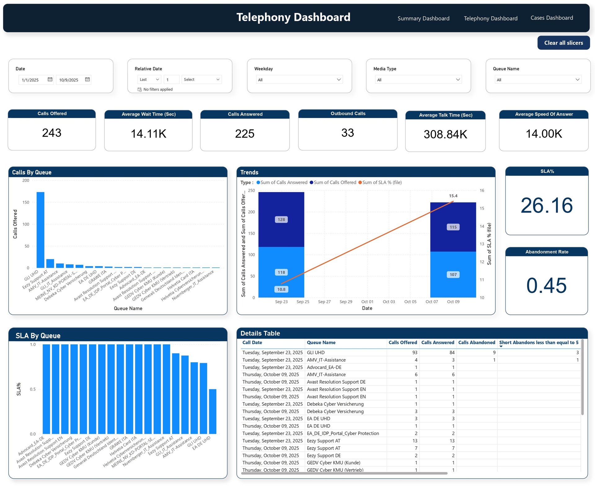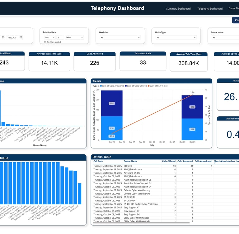 The Telephony Dashboard focuses on call-handling efficiency and service quality across multiple support queues. It provides deep visibility into average wait time, average speed of answer, average talk time, SLA performance, and abandonment rates. Queue-level breakdowns highlight which support lines receive the highest call volumes and where SLA performance may be under pressure. Trend visuals enable operations managers to identify peak periods and performance degradation over time, making this dashboard essential for workforce planning, queue optimization, and SLA compliance in a high-volume contact center environment