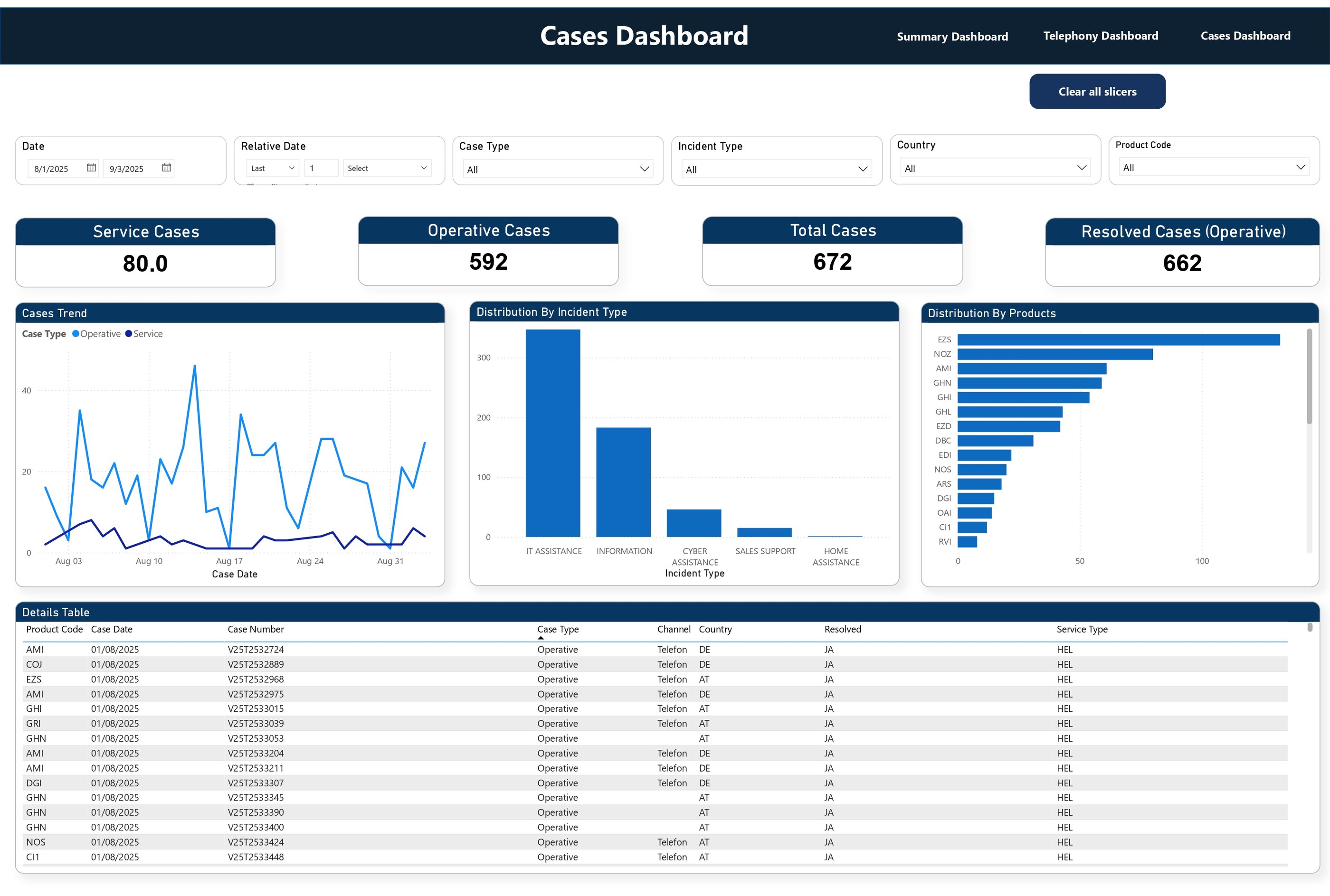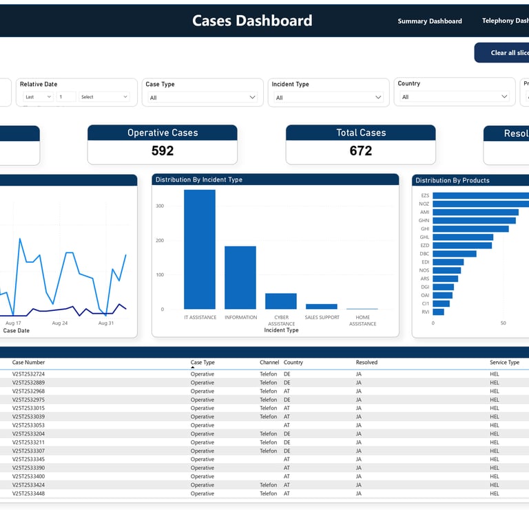 The Cases Dashboard delivers detailed insights into case lifecycle management, focusing on operative and service cases across products, incident types, countries, and channels. It tracks total cases, resolved cases, and case distribution by incident type and product, allowing teams to identify recurring issues and high-impact service categories. Case trend analysis highlights workload patterns over time, while detailed tables provide full traceability at the individual case level. This dashboard supports data-driven decision-making for service improvement initiatives, root-cause analysis, and operational optimization within Europ Assistance’s service delivery model