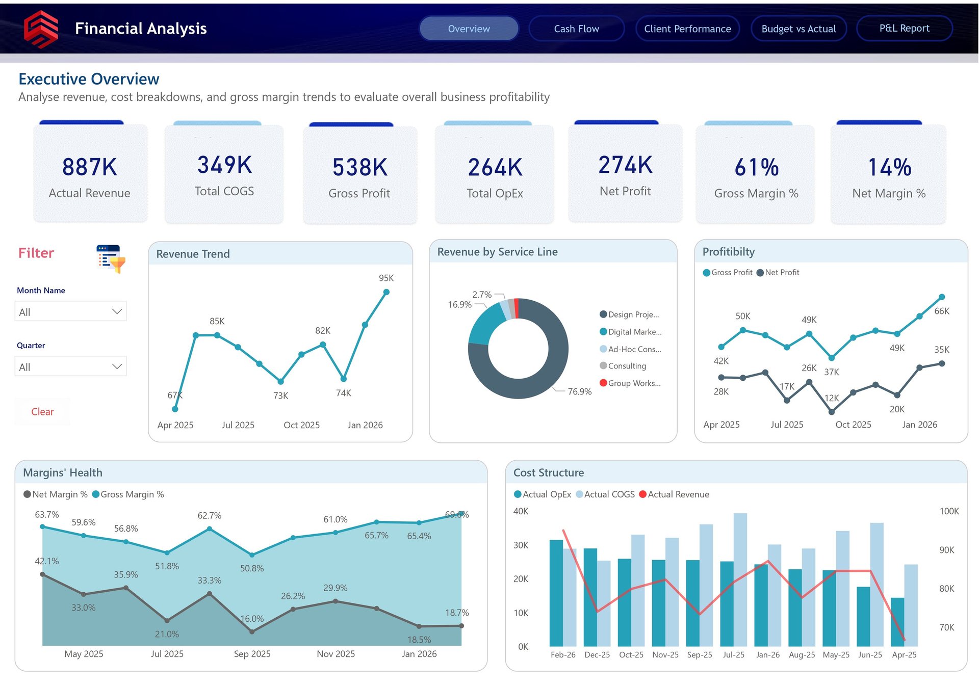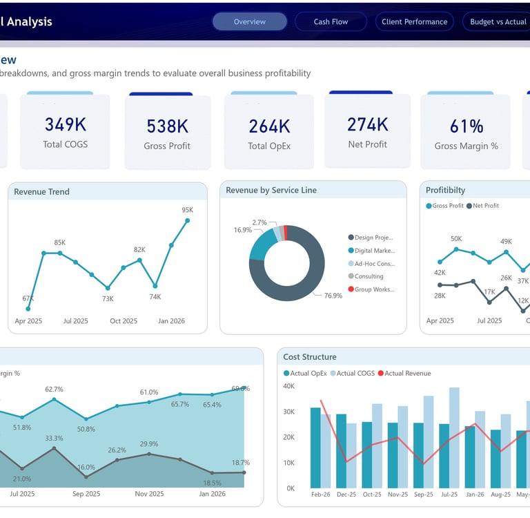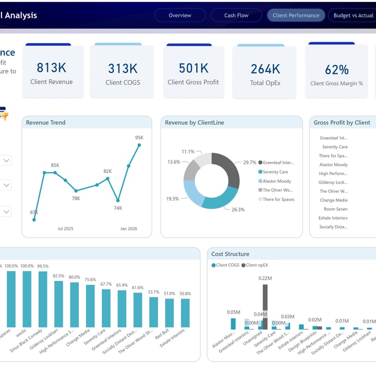 Finally, the Cost Structure visual compares client-level COGS and OpEx, making it easier to understand which clients are cost-heavy and where profitability may be leaking. This dashboard helps answer a question every service-based business needs to ask regularly: Which clients are actually profitable, and which ones need better pricing, delivery control, or strategic review?