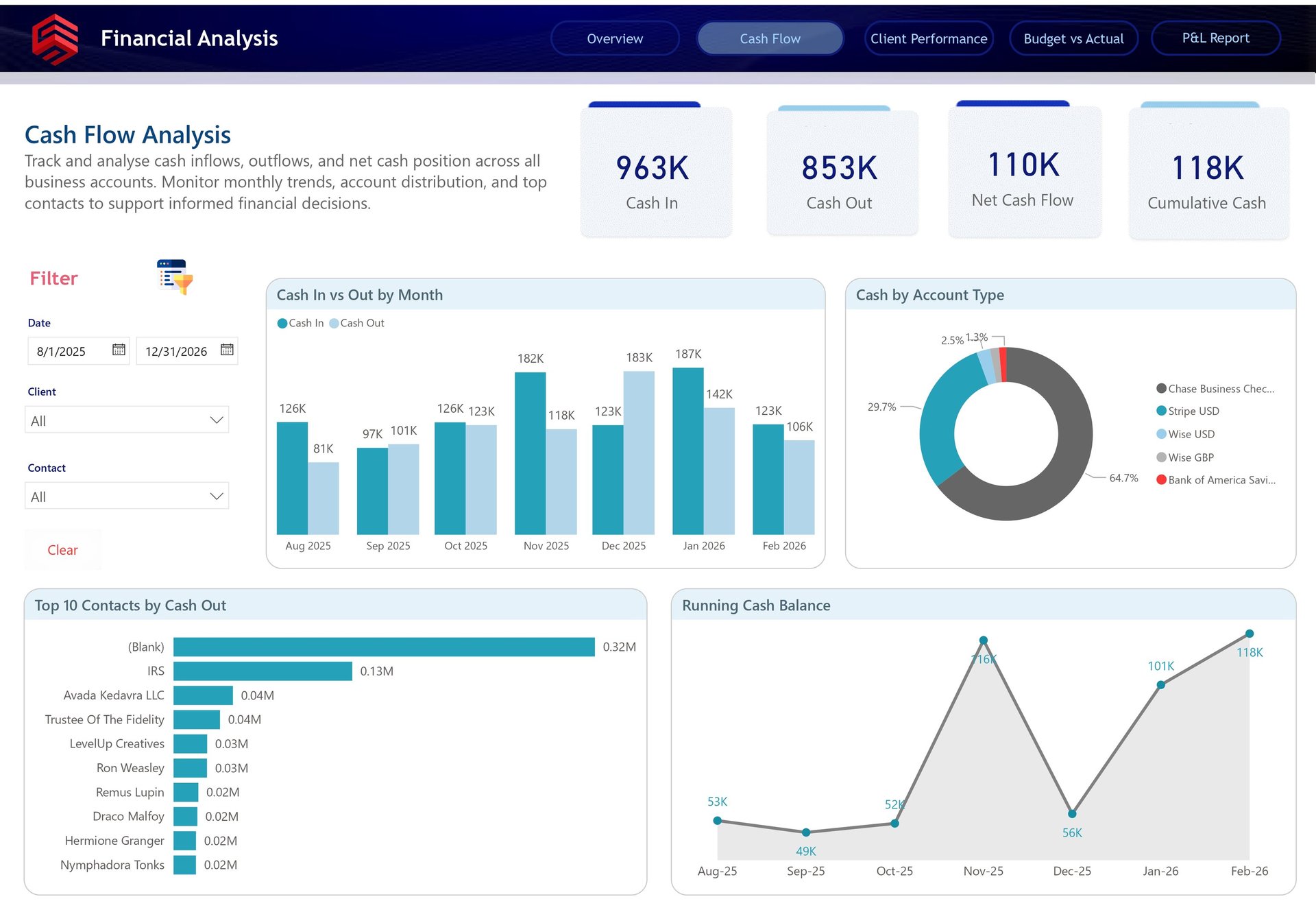 The Top 10 Contacts by Cash Out chart is especially useful for spend control. It highlights the largest recipients of cash outflows, helping the business identify major vendors, recurring expenses, tax payments, or unusual cash movements. The Running Cash Balance visual then shows how the overall cash position changes month by month, giving leadership a simple way to monitor liquidity risk.
