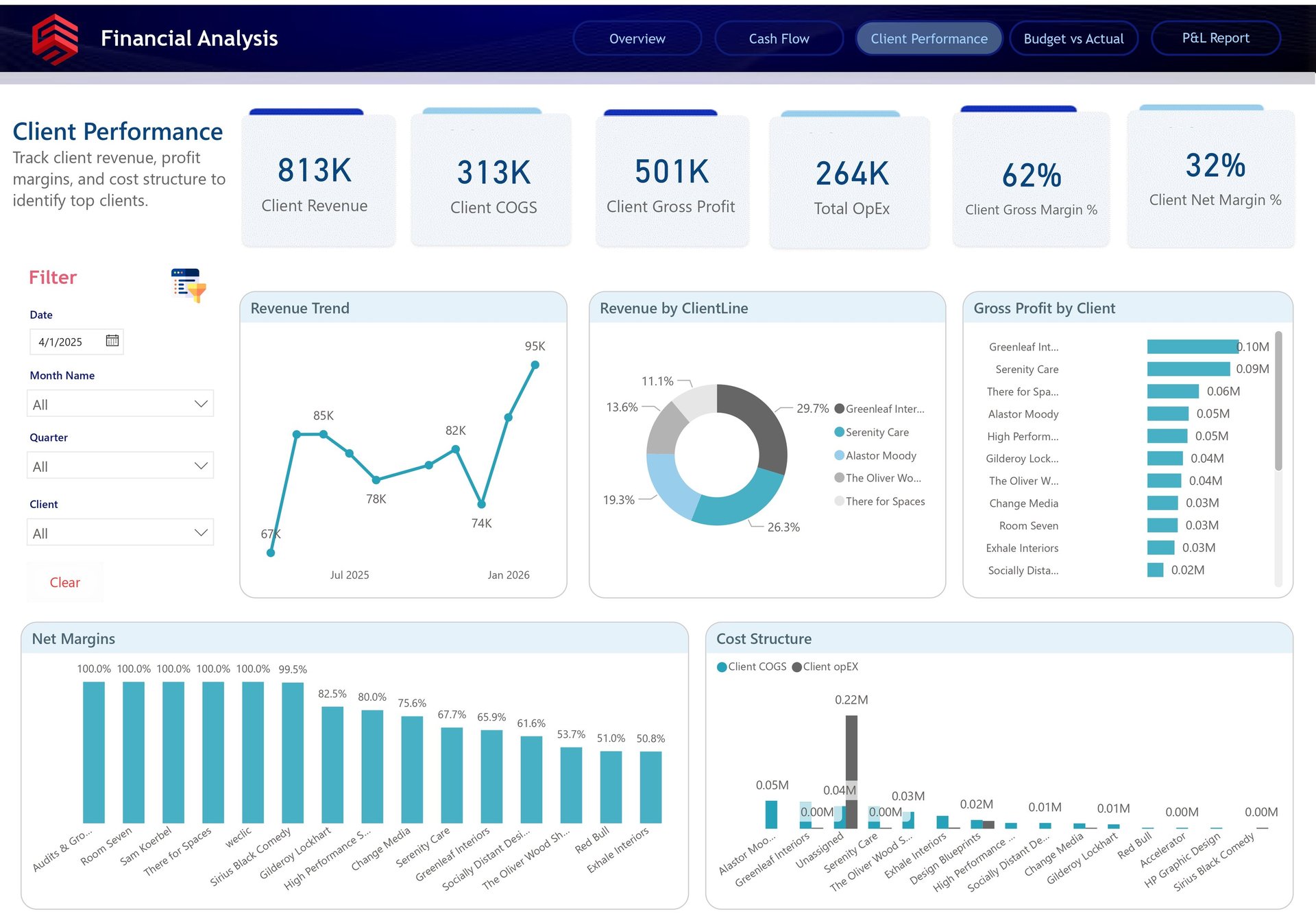 The Client Performance dashboard shifts the analysis from overall company performance to client-level profitability. This is where the report becomes especially powerful for strategic decision-making.