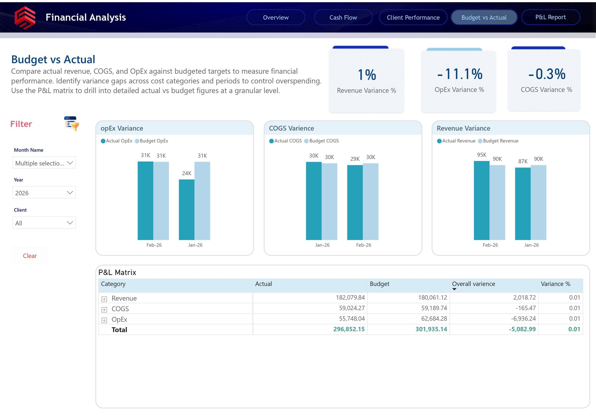 The P&L Matrix at the bottom adds the detailed financial layer. It breaks down actual, budget, overall variance, and variance percentage by category, including Revenue, COGS, and OpEx. This allows users to move from a high-level variance percentage into the exact financial line items behind the result.