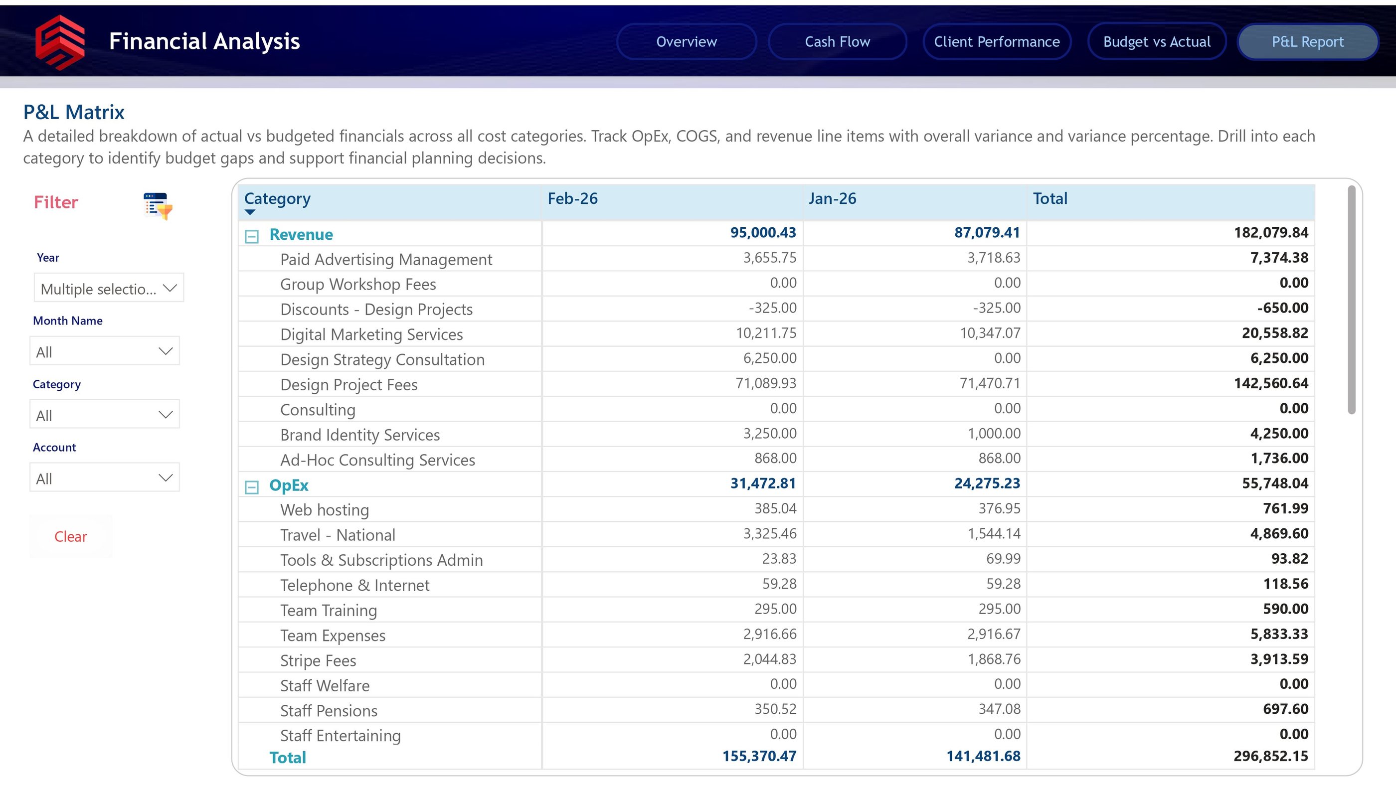 What makes this page valuable is its ability to connect summary reporting with accounting-level detail. A stakeholder may first notice an issue on the Budget vs Actual dashboard, then use the P&L Matrix to drill into the exact line item causing the variance. This creates a smooth investigation flow from executive summary to financial detail.