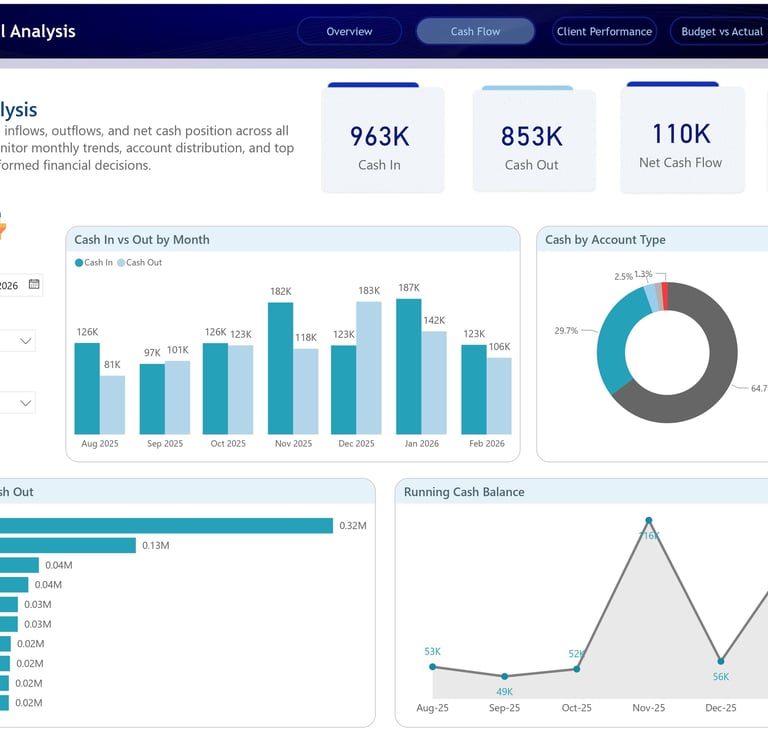 The design follows an executive-first approach. Each dashboard page answers a specific business question. The Overview page explains overall financial health. The Cash Flow page shows whether money is actually moving in the right direction. The Client Performance page highlights which clients are driving revenue and profit. The Budget vs Actual page compares financial targets against real performance. Finally, the P&L Matrix provides a detailed accounting-level breakdown for deeper financial investigation.