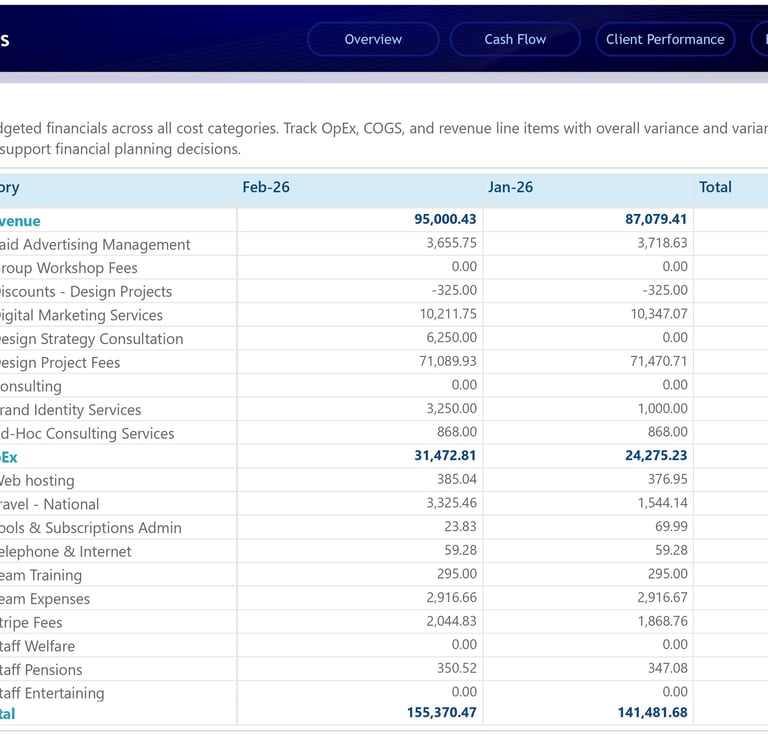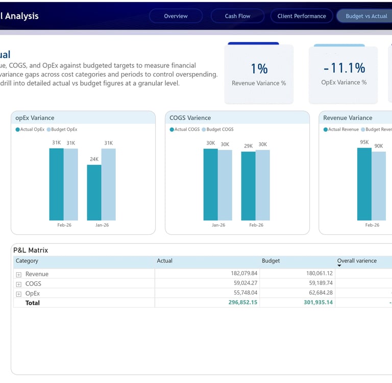 Finance teams and business owners often face the same challenge: the data exists, but the story is hidden. Revenue sits in one file, expenses in another, cash movement is tracked separately, and budget comparisons are often reviewed manually at month-end. This slows down decision-making and makes it difficult to identify problems before they become expensive.