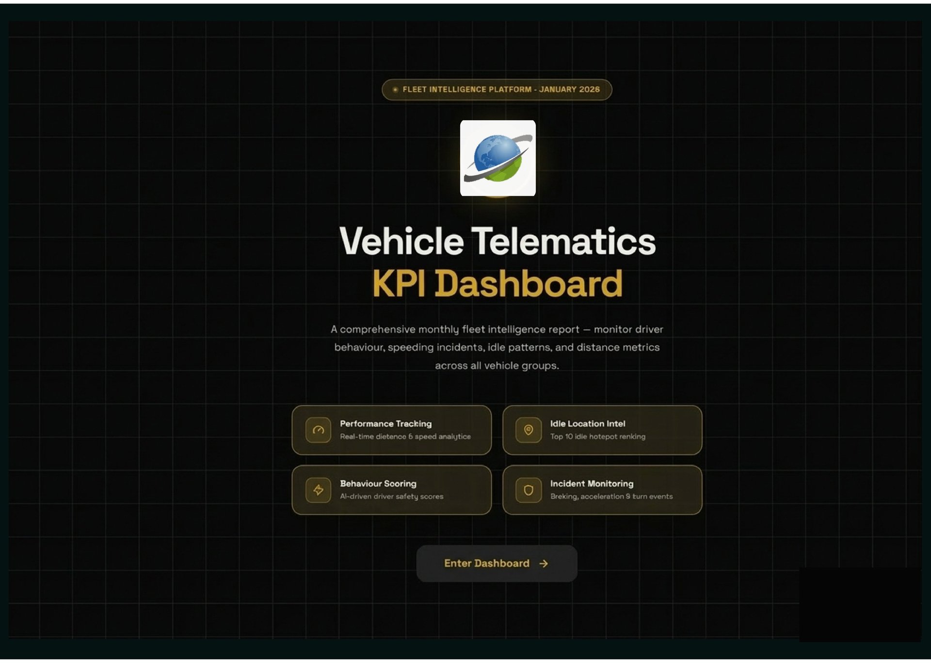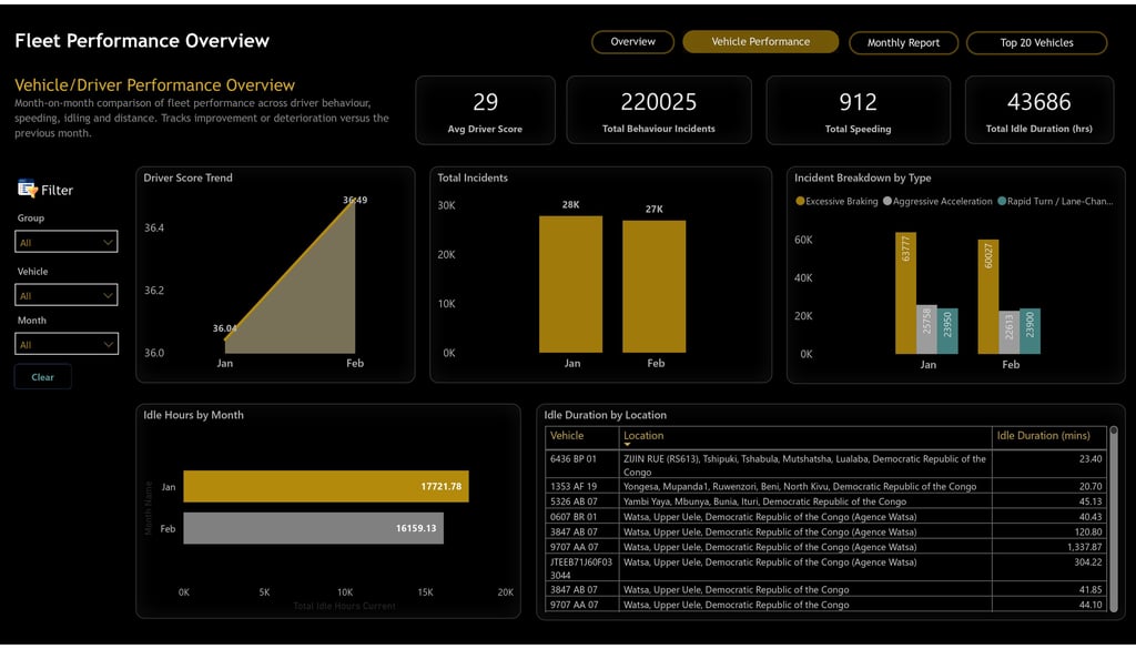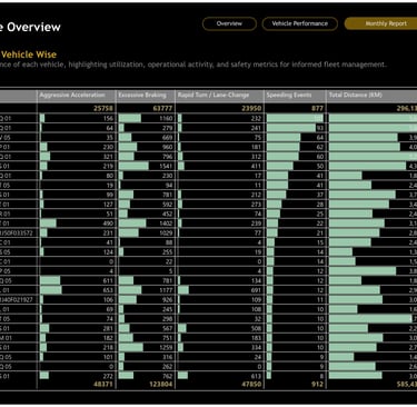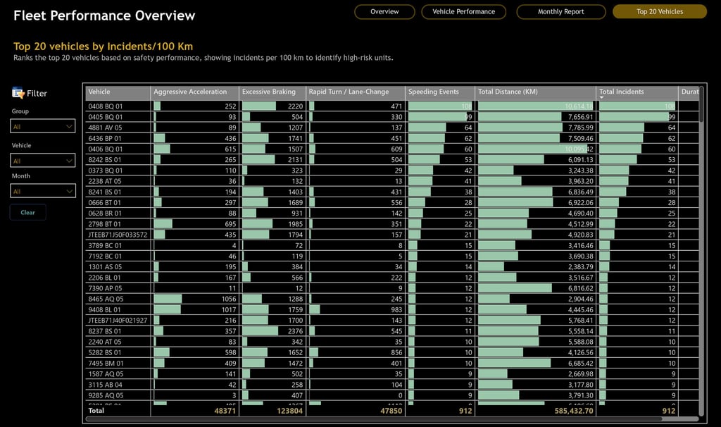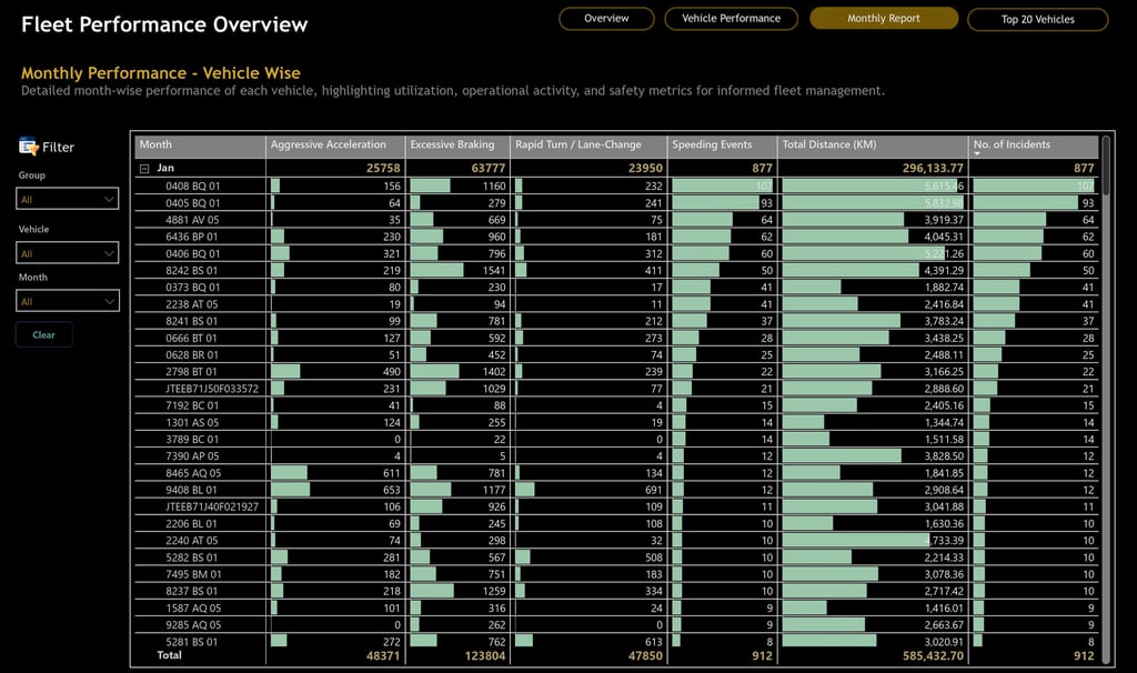 This page was designed to give fleet management teams a detailed, vehicle-level view of monthly operational and safety performance, moving beyond top-line KPIs into the specific activity patterns that shape fleet efficiency and risk. The report tracks key telematics indicators such as aggressive acceleration, excessive braking, rapid turns or lane changes, speeding events, total distance covered, and total number of incidents for each vehicle, allowing stakeholders to compare units in a structured and highly actionable way. By presenting the data at this level of detail, the dashboard helps management quickly identify which vehicles are contributing most to unsafe driving behaviour, which ones are covering higher operational distance, and where intervention may be needed. This makes the page valuable not just as a reporting layer, but as a practical management tool that supports driver coaching, safety monitoring, and operational review. The inclusion of filters for group, vehicle, and month adds another layer of analytical flexibility, enabling users to isolate specific segments of the fleet and perform more focused investigation. Overall, this page transforms raw telematics data into a decision-ready performance view that strengthens visibility, accountability, and control across fleet operations.