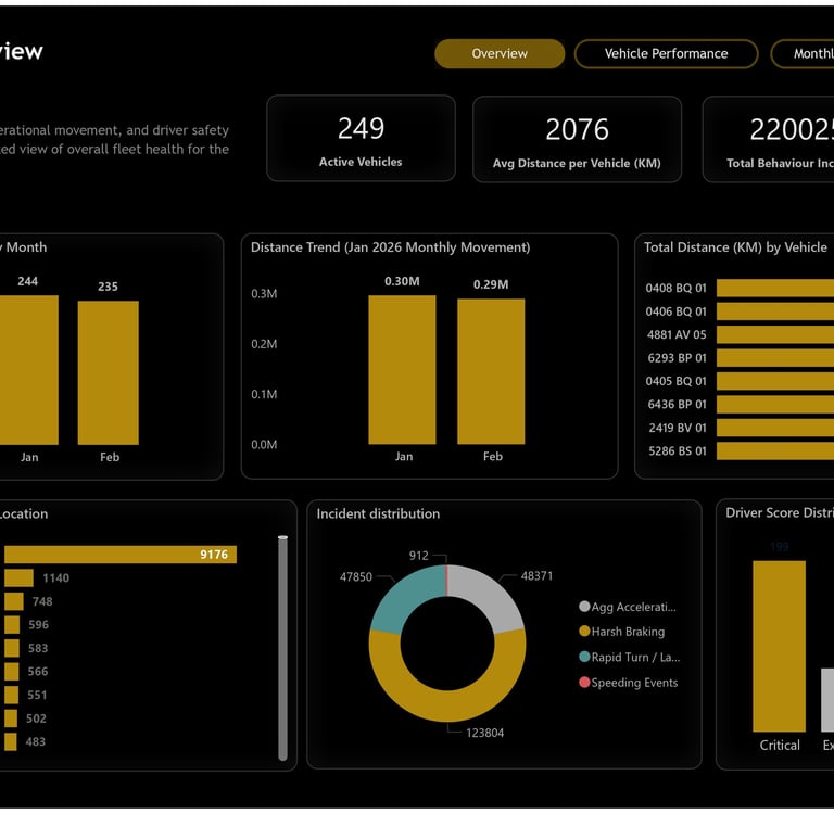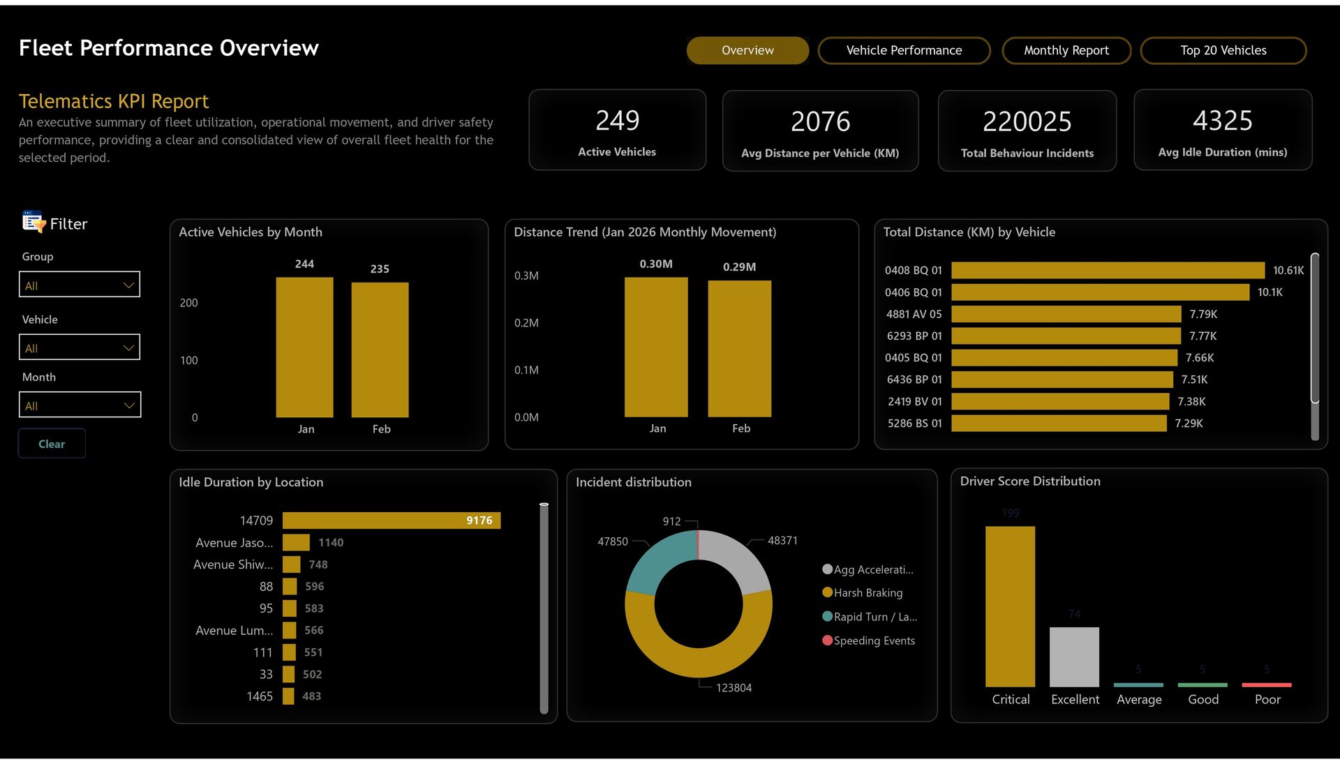 The executive overview page was built to help management quickly assess the overall health of the fleet through a combination of headline KPIs and visual summaries. This page highlights active vehicles, average distance per vehicle, total behaviour incidents, and total idle duration, giving leadership an instant understanding of utilization, movement, and operational risk. It also brings together supporting visuals for distance trends, top vehicles by distance covered, idle duration by location, incident distribution, and driver score distribution, making it easier to identify where inefficiencies and safety concerns are concentrated. In January 2026 alone, the dashboard summarized 286 active vehicles, 1,035 average distance per vehicle, 113,485 total behaviour incidents, and 146,027 total idle minutes, creating a compact but highly actionable operational snapshot.