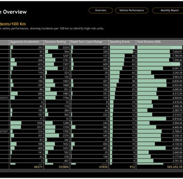 The final page focuses on prioritization and intervention. I designed this view to rank the top 20 vehicles based on incidents per 100 kilometres, which creates a much more meaningful performance benchmark than simply looking at raw incident counts. This is important because high-distance vehicles naturally generate more activity, so a normalized metric gives management a fairer way to identify genuinely high-risk units. By combining this ranking with the underlying behaviour indicators and distance metrics, the page helps the client quickly isolate vehicles that may be underperforming from a safety standpoint and supports more informed decisions around driver monitoring, coaching, and operational control.